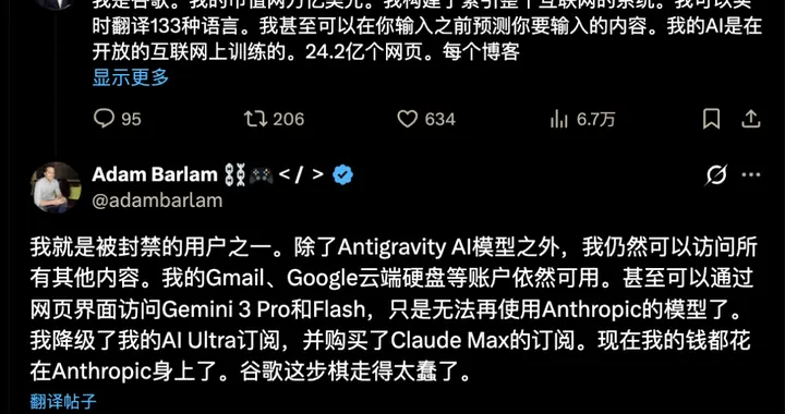 部分用户发现自己不仅被踢出了谷歌 AI IDE Antigravity,连带着绑定的 Gmail 等核心服务也一并被锁。