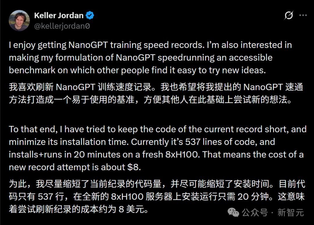 为此,他刻意做了几件事,比如让代码压缩到极简,只有537行;在8×H100的全新环境下,让安装和运行的时间仅为20分钟;甚至单次的尝试成本,低至8美元。