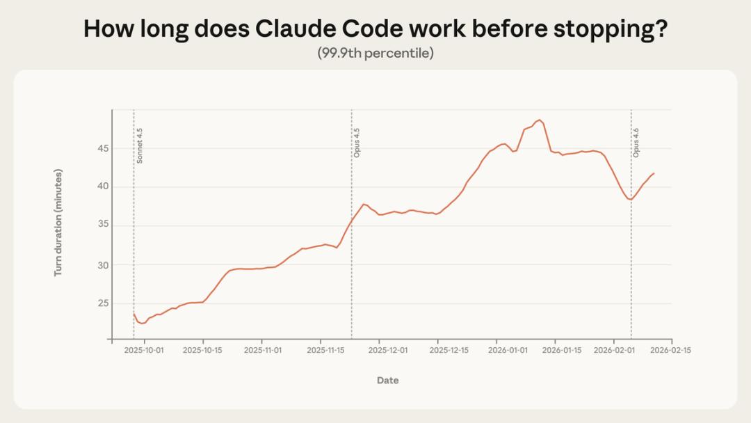 2025年8月到12月,Claude Code在最困难任务上的成功率翻倍,每次会话中人工介入的次数从5.4次降到了3.3次。
