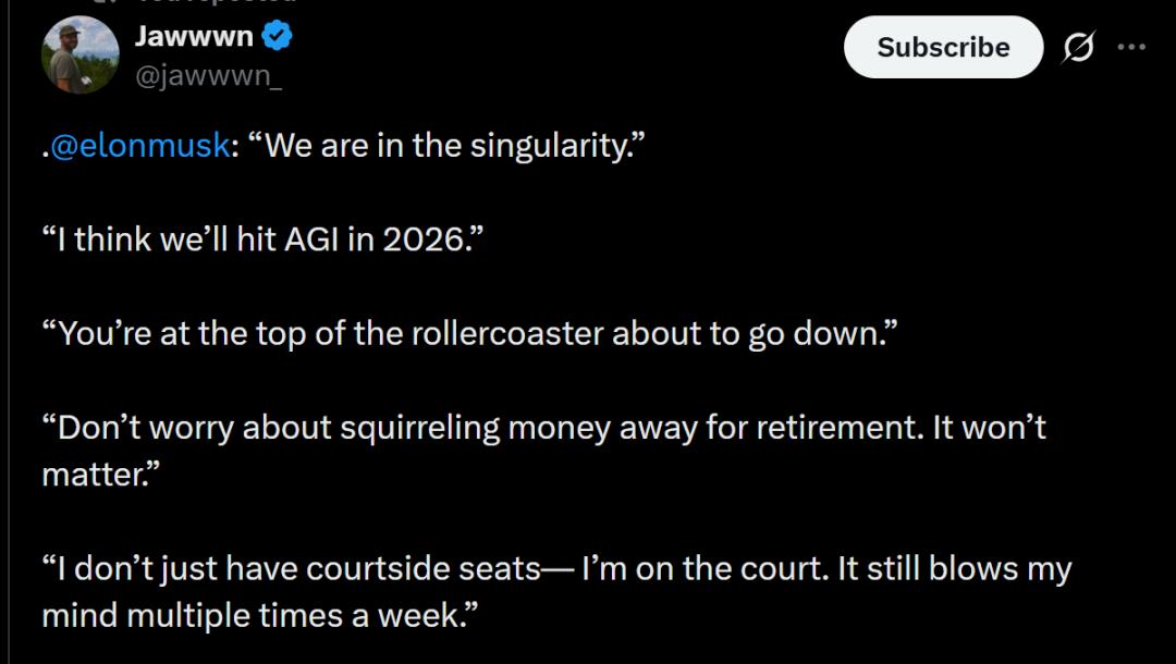 在他看来,我们会在2026年实现AGI。现在,我们正处于即将下去的过山车的顶端。根本不用攒钱退休,因为这个问题压根无关紧要。