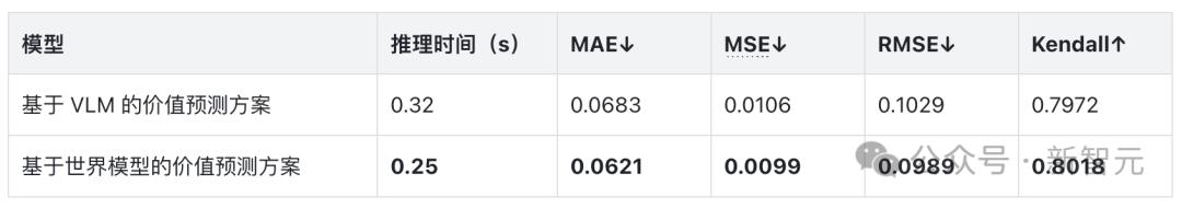 实验结果表明,基于世界模型的价值预测方案在执行效率与预测精度上,均优于 π*0.6 提出的 VLM 方案。