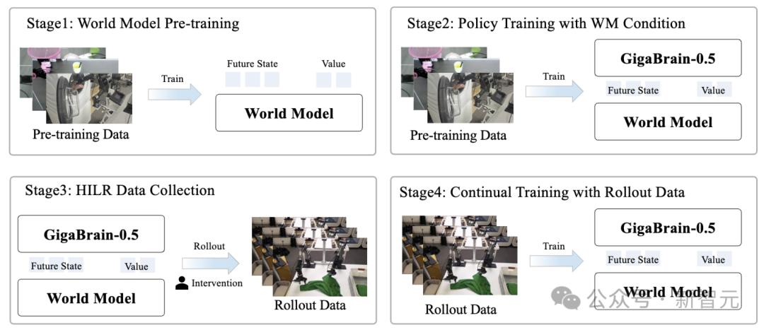 在 GigaBrain-0.5M* 的研发中,极佳视界提出基于世界模型的强化学习范式,并采用迭代式四阶段闭环训练流程: