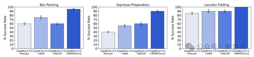 在与 AWR、RECAP 等主流模仿学习与强化学习基线方法的系统对比中,GigaBrain-0.5M* 展现出显著优势,在相同任务设定下,相较于由 π*0.6 所提出的 RECAP 基线,任务成功率提升近 30%,并实现了稳定可靠的模型效果。