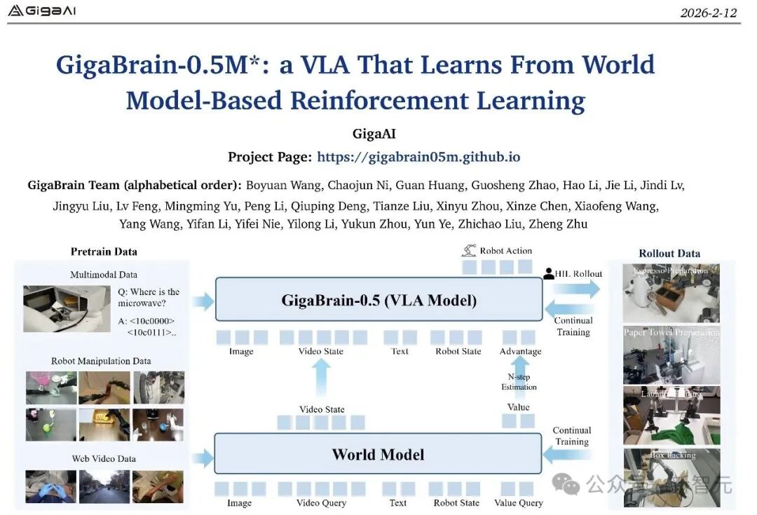 【新智元导读】极佳视界具身大模型 GigaBrain-0.5M*,以世界模型预测未来状态驱动机器人决策,并实现了持续自我进化,超越π*0.6实现 SOTA!该模型在叠衣、冲咖啡、折纸盒等真实任务中实现接近 100% 成功率;相比主流基线方法任务成功率提升近 30%;基于超万小时数据训练,其中六成由自研世界模型高保真合成。