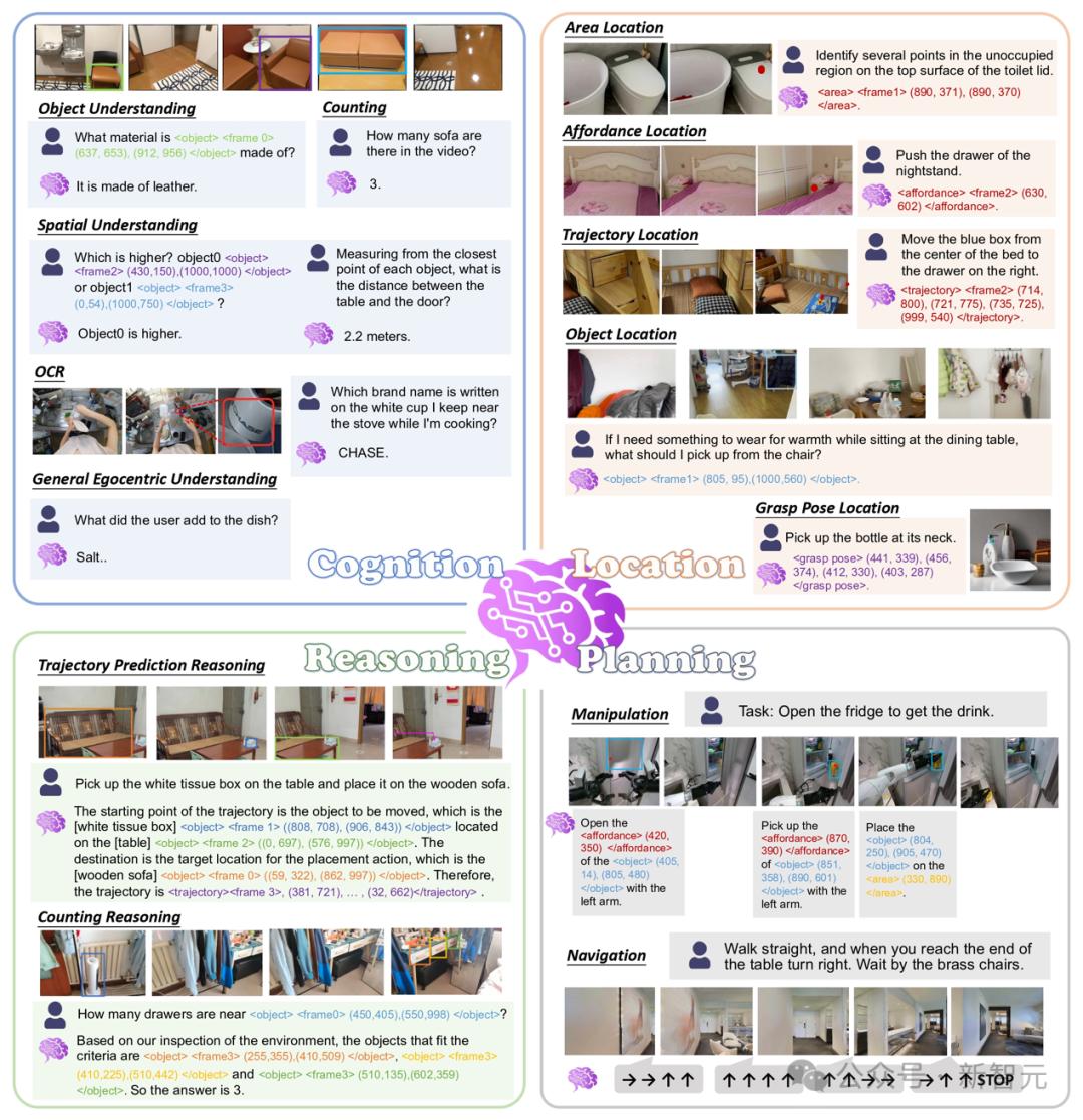 - 具身定位数据:五大定位任务分别标注大量视频和图像数据,分别为:物体定位、区域定位、操作点定位、轨迹定位和夹爪位姿定位。