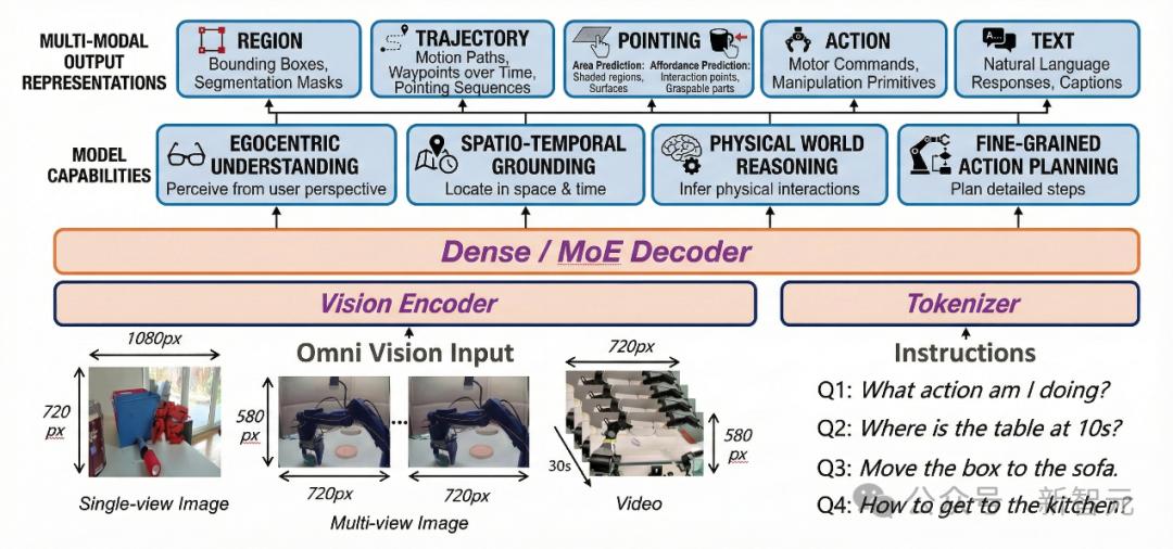 - 输出端则统一了区域、轨迹、点集、夹爪位姿和文本等多种具身相关模态。