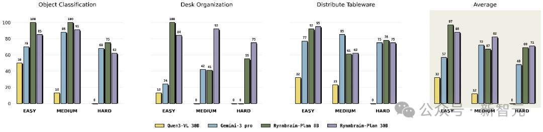 另外,在操作规划任务中,仅用几百条数据微调,RynnBrain-Plan-30B(A3B)便在域内和域外的任务上全面超越Gemini 3 Pro。