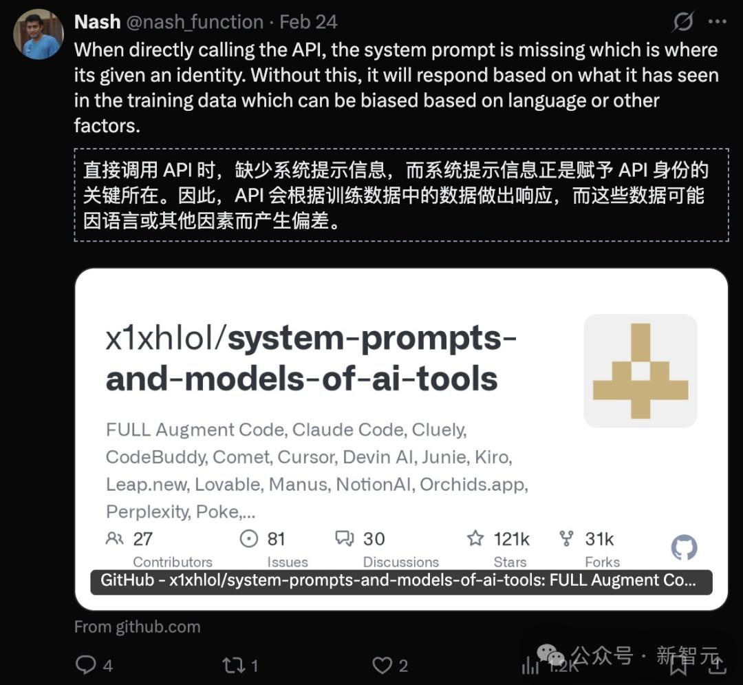 如果在中文数据分布中,「我是DeepSeek」这种模式概率较高,那么在没有系统提示的情况下,模型就可能走向那条高概率路径。