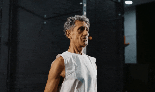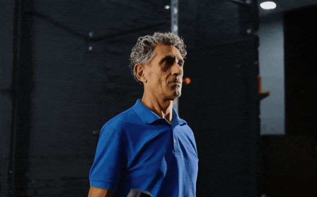 角色的衣服不满意?直接一键修改。比如这位举杠铃的老人,白背心一键被变成了蓝色T恤,画面自然得看不出改动痕迹。
