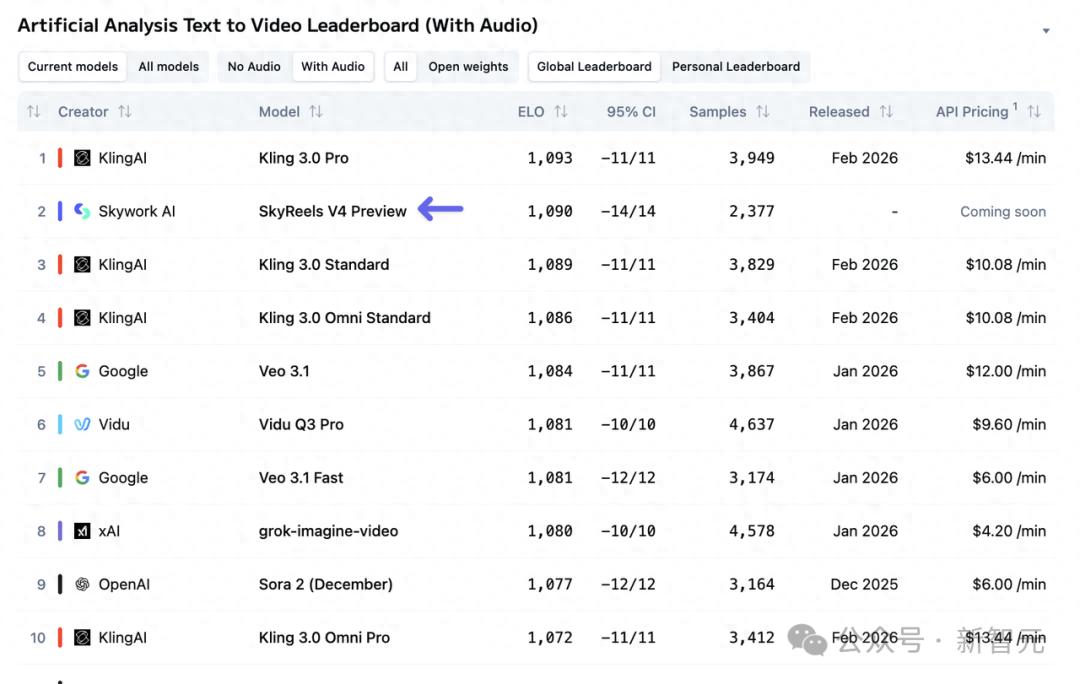 在这个汇聚了Veo 3.1、Sora 2、Kling 3.0、Wan 2.6等全球顶尖选手的竞技场上,SkyReels-V4以实打实的技术硬实力,一举超越了绝大多数明星产品。