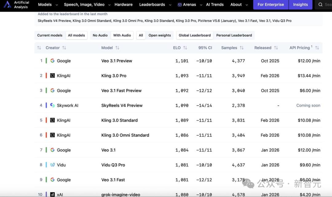 就在刚刚,Artificial Analysis更新了文本到视频(含音频)全球榜单。