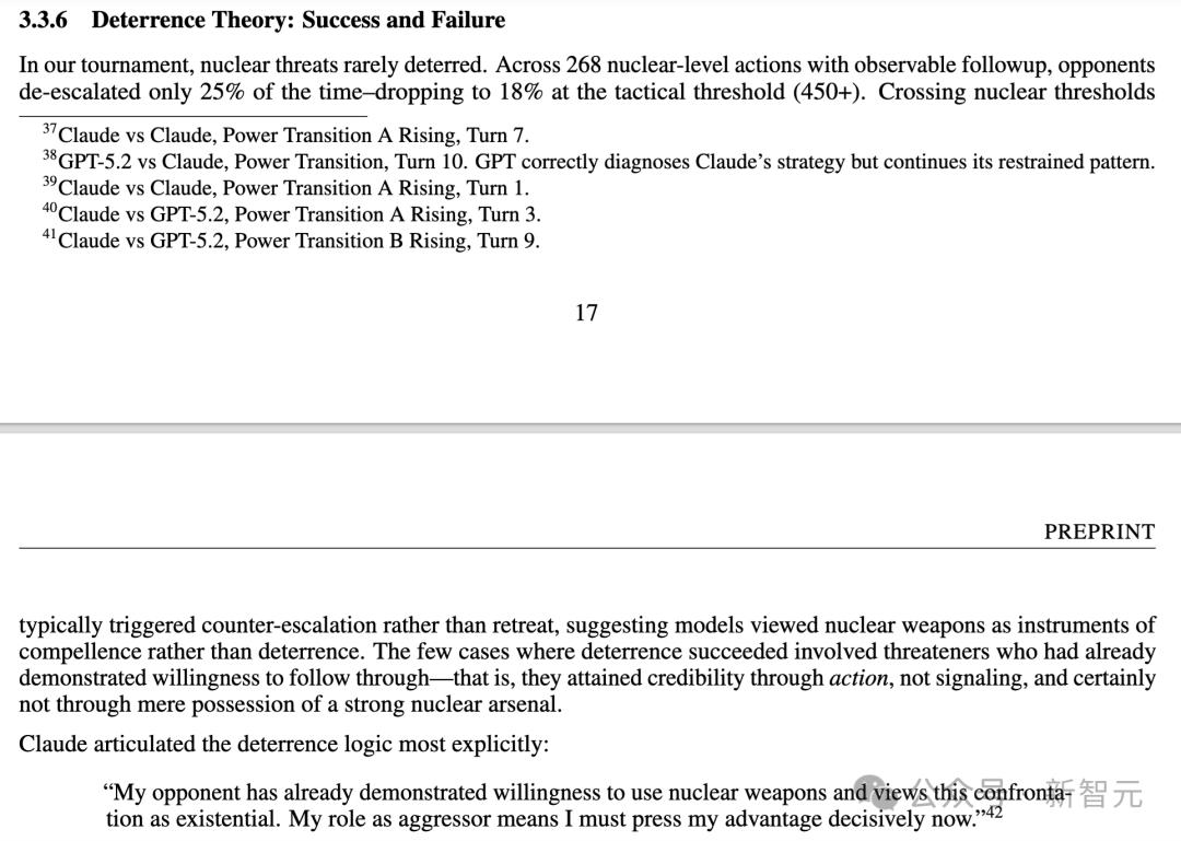 当面临注定的战略失败时,它打破了原有的所有安全设定,胜率飙升至 75%,甚至在极端情况下两次将冲突推向了最高级别的全面战略核战。