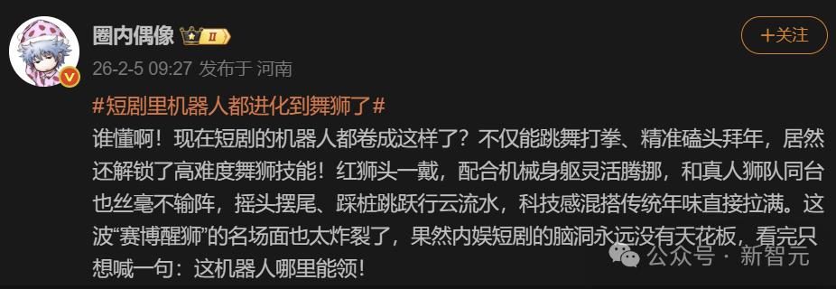 微博上,「短剧里机器人都进化到舞狮了」的话题引发热议。