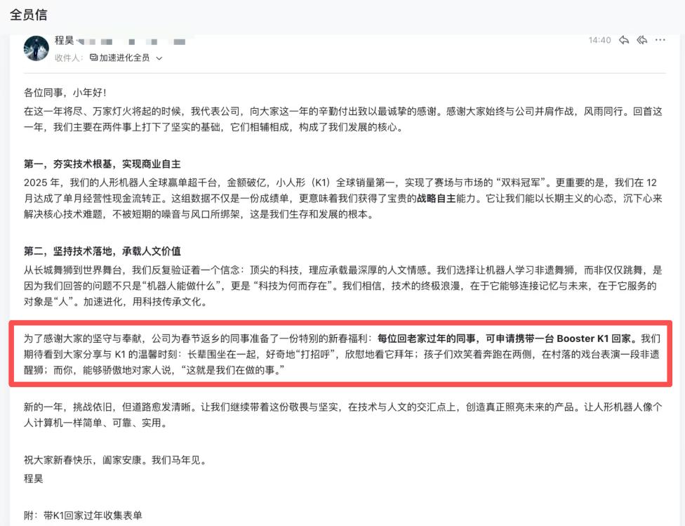 也正因如此,春节返乡的员工们有了一项特别的福利——可以申请携带一台Booster K1回家过年!