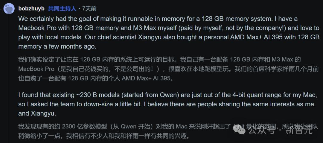 我们的确有一个目标,就是让它能够跑在一个128 GB内存系统的内存中。我自己为了跑模型,自掏腰包买了一台128GB内存的Macbook Pro,而我们的首席科学家也买了一台128GB内存的AMD机器。
