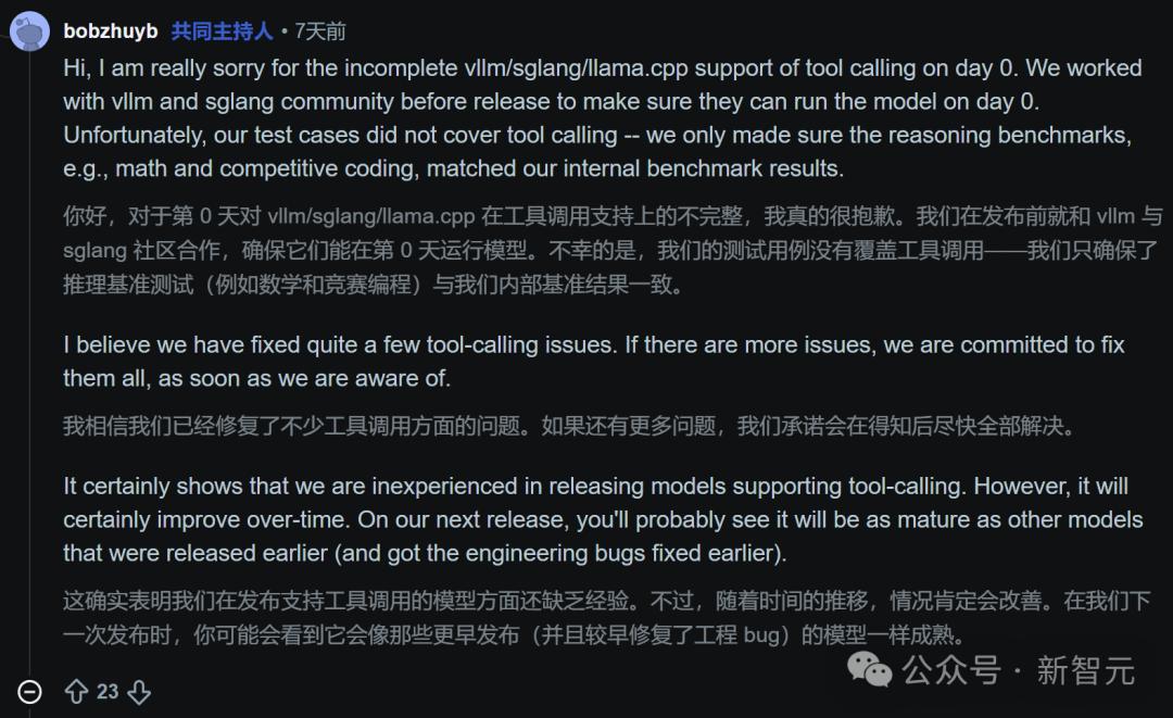 这确实暴露出我们在发布支持工具调用的模型方面经验不足……我们只确保了数学和编码的基准测试结果,但测试用例没有覆盖到工具调用的工程实现。