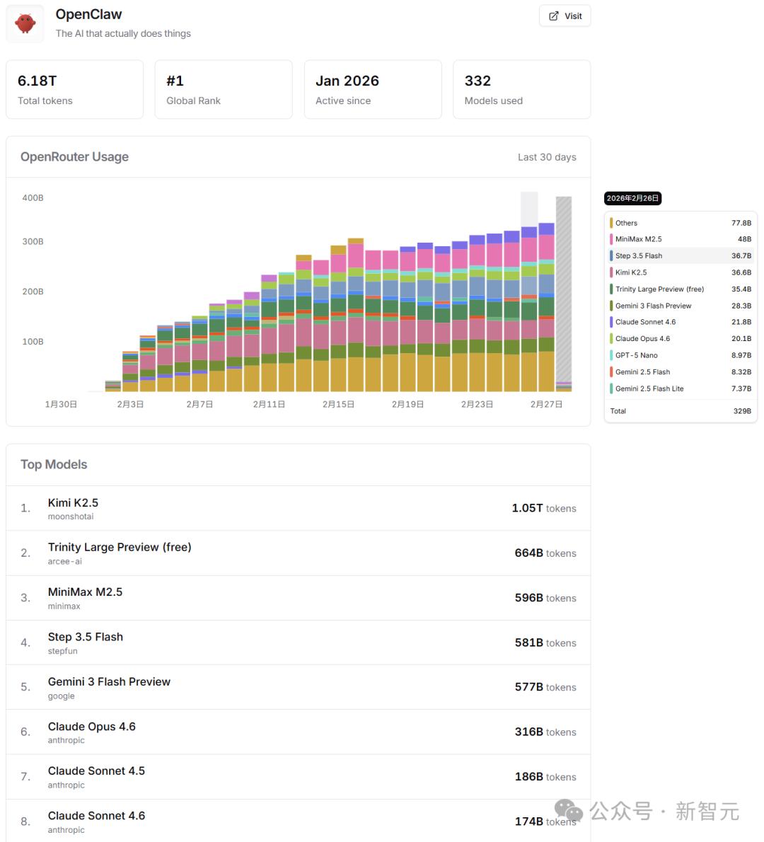 根据「Last 30 days」调用量排行,Step 3.5 Flash目前稳居全球第四;2月26日以来,单天调用量则直接冲到了第三的位置。