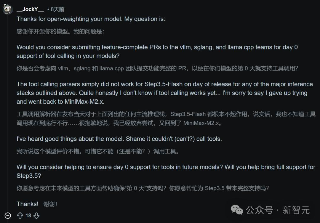 有开发者尖锐地指出,Step 3.5 Flash在发布首日,工具调用在vLLM、llama.cpp等主流推理栈上完全不可用,甚至直接放弃测试退回了竞品模型。
