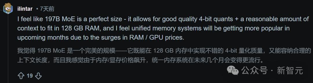 知名评论者ilintar激动地留言:「我觉得196B MoE是一个完美的参数规模——它允许高质量的4-bit量化加上合理的上下文长度刚好能放入128 GB内存中。」