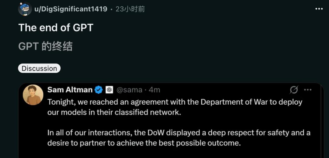就在Anthropic被「封杀」的同时,劲敌OpenAI迅速补位,官宣与五角大楼达成协议。