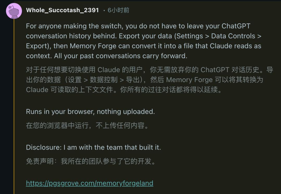 只要导出你的数据(设置 > 数据控制 > 导出),Memory Forge就能把它转换成Claude可读取的上下文文件。