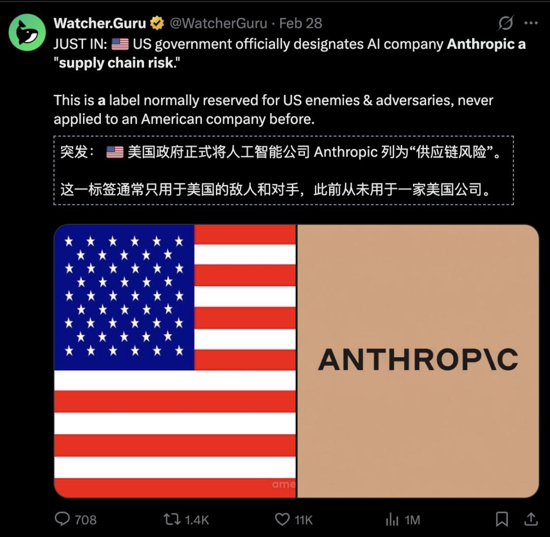 Hegseth还将Anthropic列为「供应链风险」,并表示所有与军方有业务往来的公司,预计都必须切断「与Anthropic 的任何商业往来」。