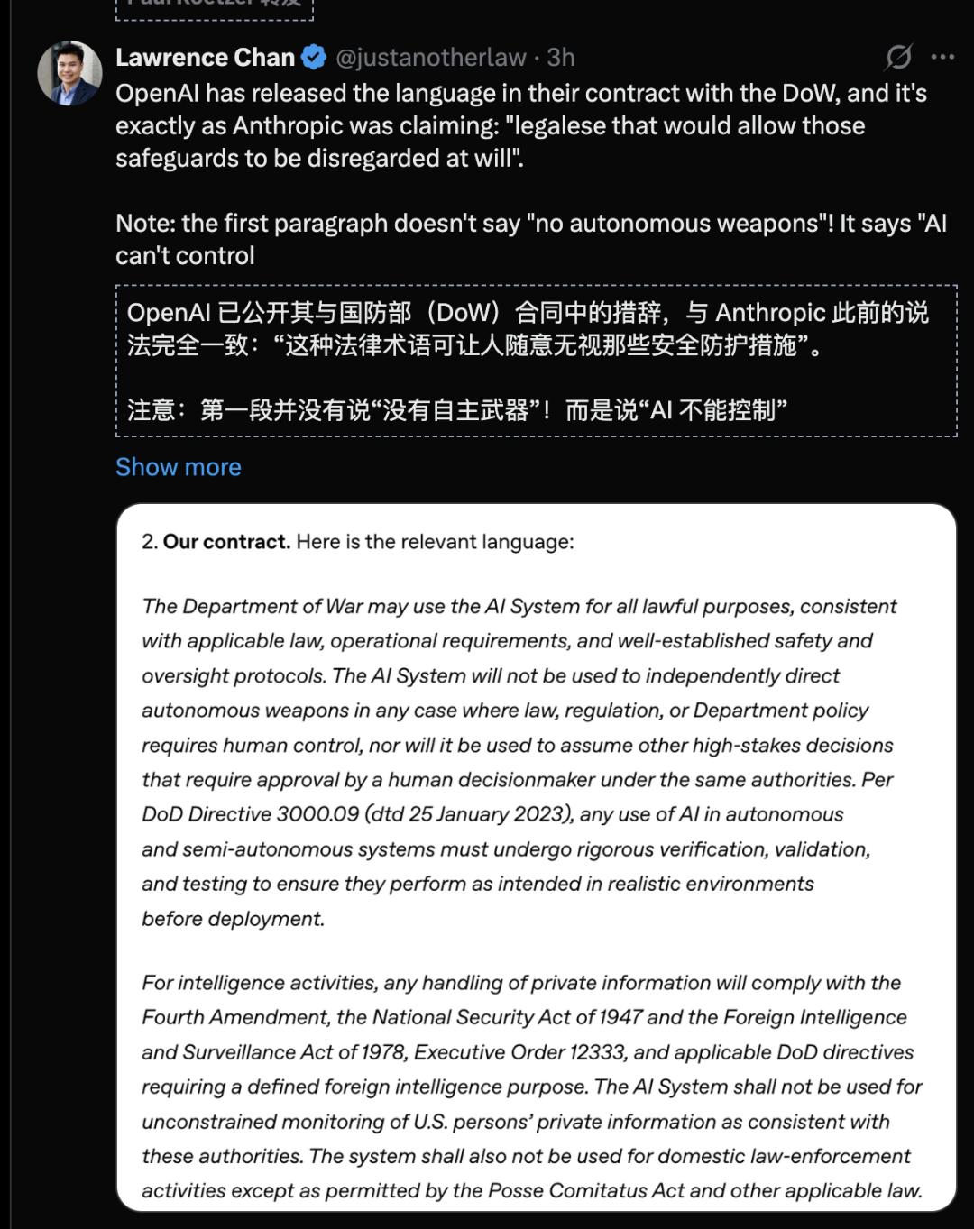 此外,OpenAI也曝光了与五角大楼的合同,证实了Anthropic所言非虚。