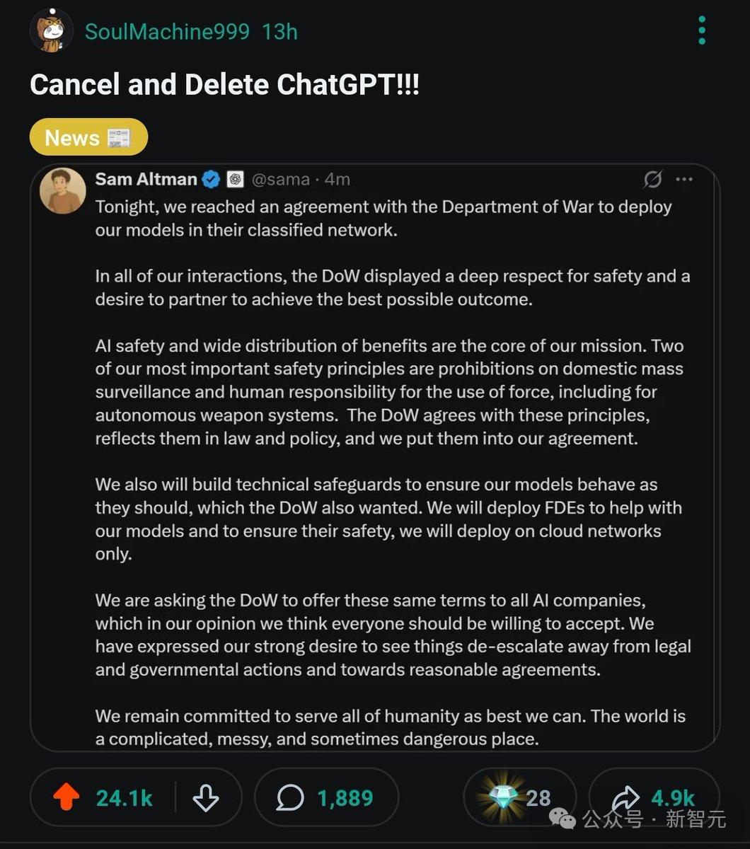 自奥特曼官宣与国防部合作后,全网掀起了一场大规模的「抵制ChatGPT」的运动,如今愈演愈烈。