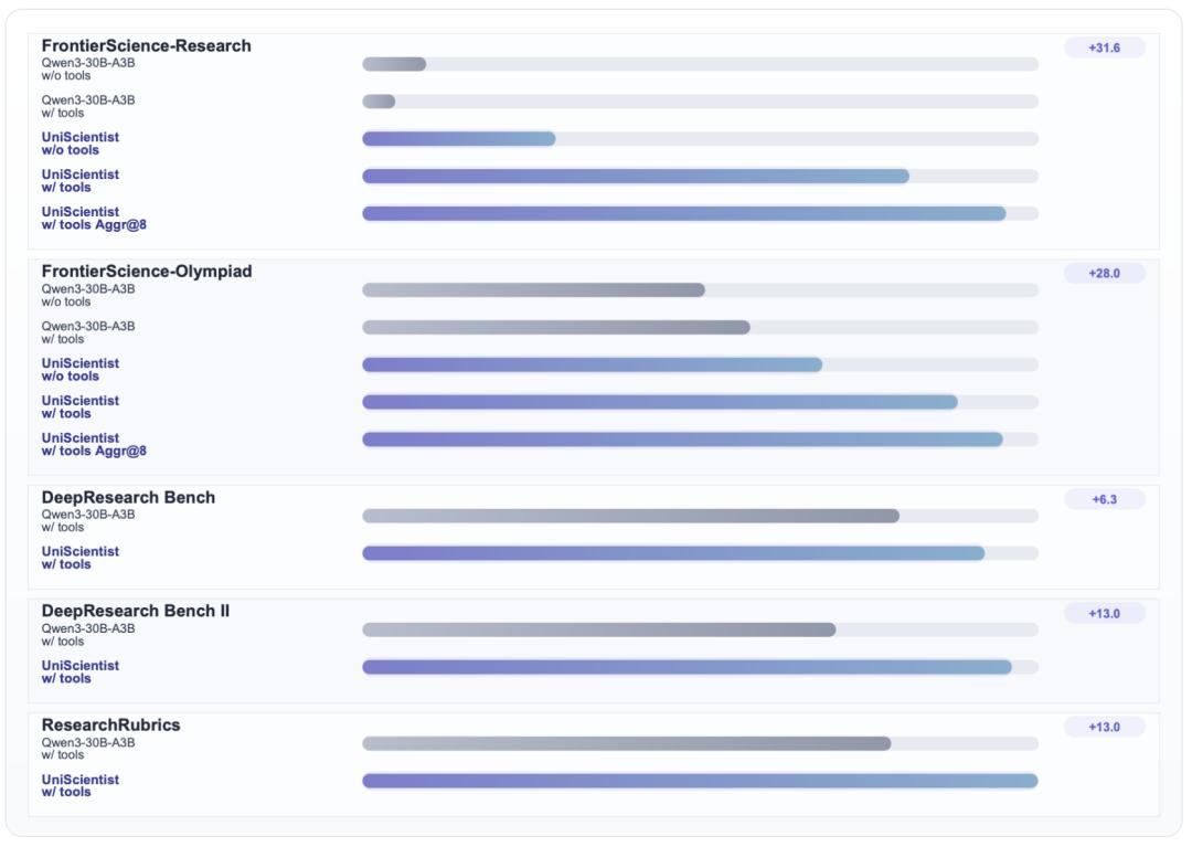 UniScientist-30B-A3B——一个仅有 3B 激活参数的小模型——在 FrontierScience-Research 上达到 28.3 分,超越 Claude Opus 4.5(17.5)、Gemini 3 Pro(12.4)和 GPT-5.2 xhigh completion mode(25.2)以及工具调用模式下的 DeepSeek V3.2(26.7)和 Seed 2.0 Pro(26.7)。在成果聚合模式下,得分达到 33.3。