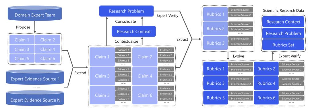 - 从经过专家验证的科学 Claim 出发,将其扩展为研究级问题——跨越多个相互依赖的子问题,要求实验设计与推导协同