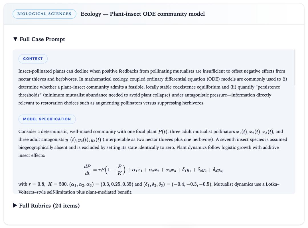 数据集中包含了具备真实科研质感的研究问题。下图展示的是一道生态学方向的示例,完整案例库可在