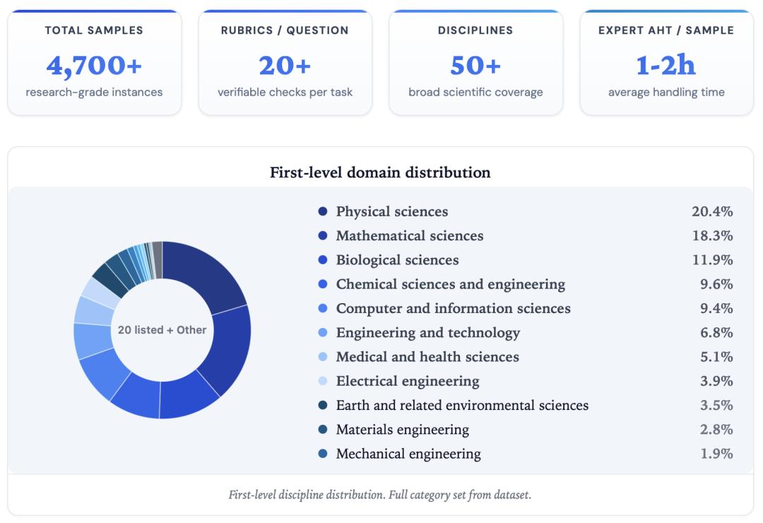 专家标注平均每条样本投入 1-2 小时。学科覆盖从量子物理和有机化学到社会文化人类学和计算语言学均有涉及。