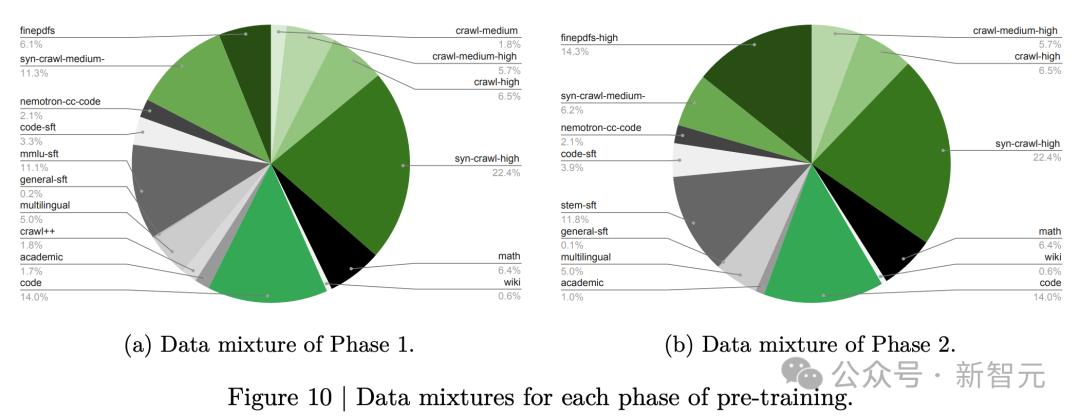 第二阶段吃掉剩下的20%(5万亿Token),这部分全是精挑细选的高质量数据,维基百科、高质量PDF、STEM推理数据的权重被大幅提升,专门用来拉升准确率。