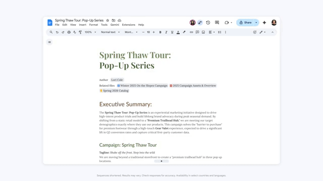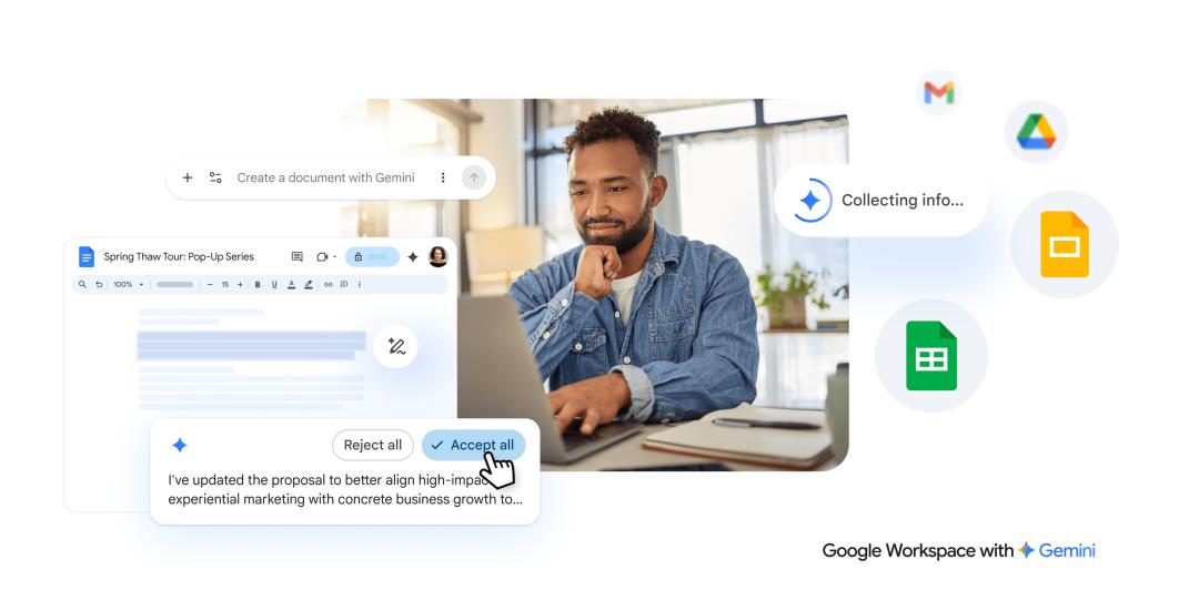 这次重新定义内容创作的方式将文档、表格、幻灯片和云端硬盘中的Gemini助手,升级为陪伴你整个创作过程的协作战友。