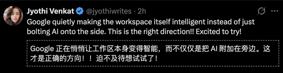 不是让把AI附加在旁边,而是让WorkSpace本身更智能,这一步,谷歌是真的做对了。
