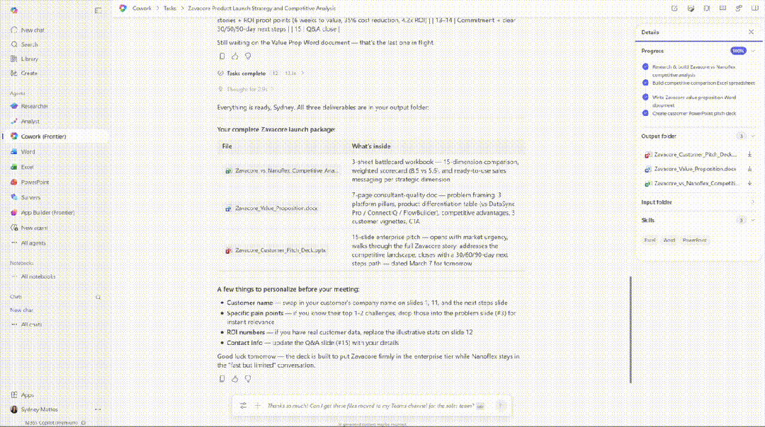Cowork能帮你在Excel中建立竞品对比表,把差异化优势提炼成价值主张文档,生成一份面向客户的推介PPT,还能规划好里程碑、责任人和下一步行动计划。