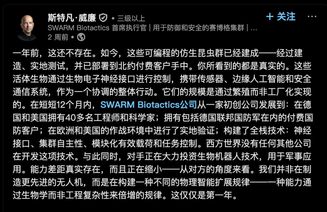 公开资料显示,这家名叫 SWARM Biotactics 的公司,确实在做基于活体昆虫的生物机器人系统,目标场景就是国防、国家安全、灾害响应和工业巡检。