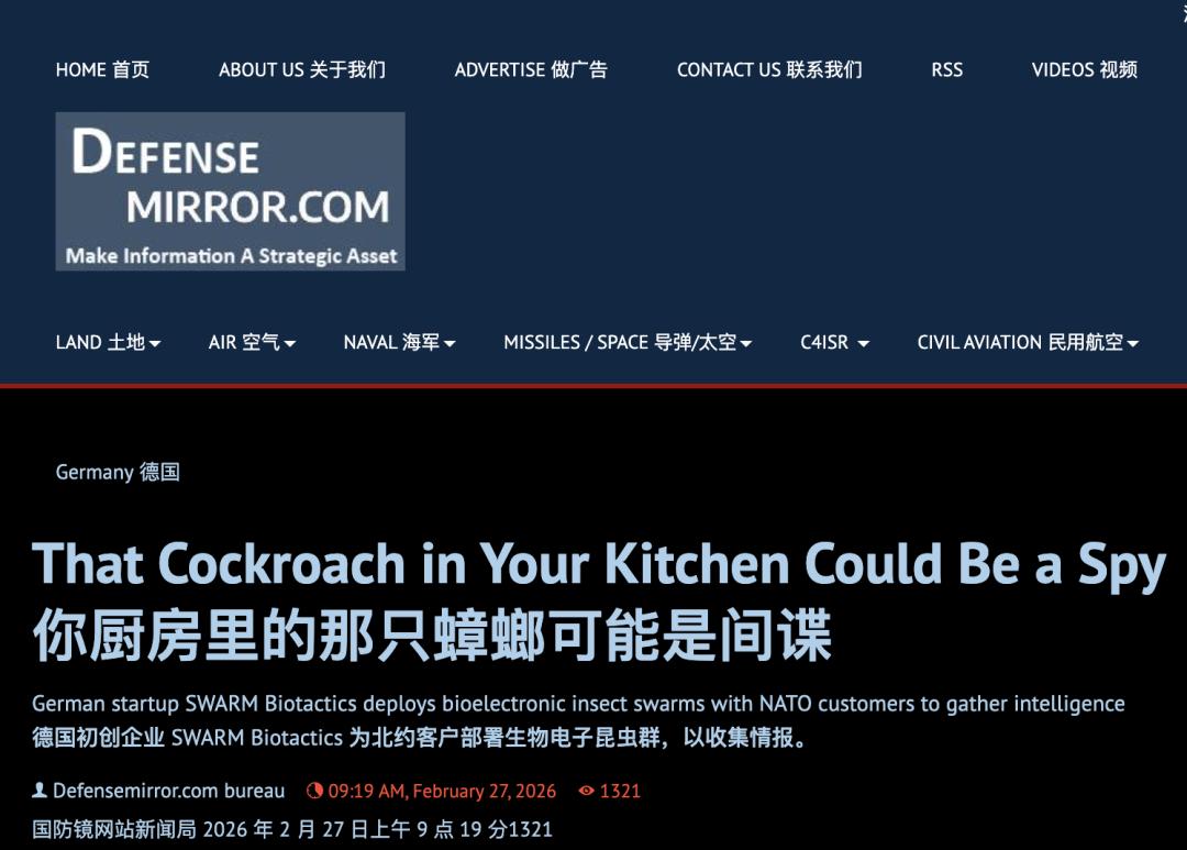 美国国防部高级研究计划局 DARPA 在 2006 年就启动了 HI-MEMS(Hybrid Insect Micro-Electro-Mechanical Systems) 项目,目标就是研究把微机电系统嵌入昆虫体内,构建机器与昆虫的紧耦合接口,用于侦察等任务。