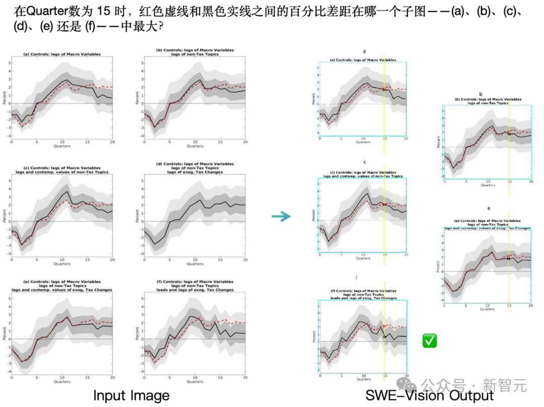 如下图所示,这是科研场景中常见的图表分析任务:我们要求模型判断,在Quarters=15时,哪一张子图中红色虚线与黑色实线之间的差距最大。