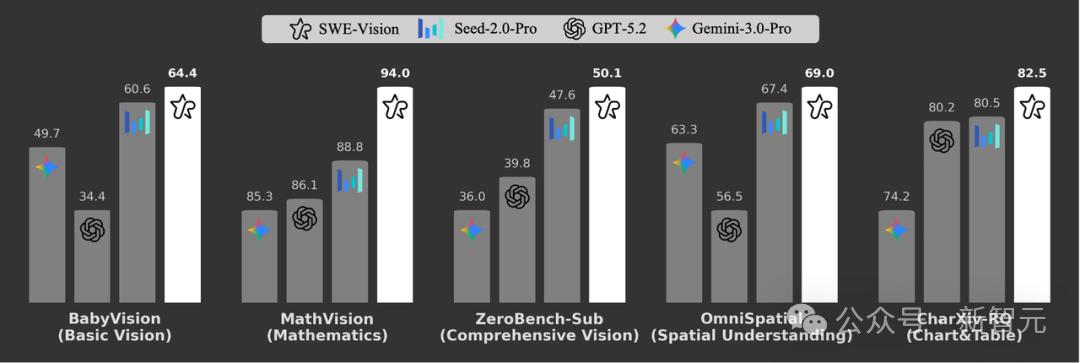 其结果令人瞩目:在五个不同的视觉基准测试中——涵盖基础感知、图表推理、数学问题解决、空间理解和复杂的多步骤视觉挑战——SWE-Vision始终改进了前沿LLM,如GPT-5.2-xhigh和Seed-2.0-Pro,并取得了最先进的结果: