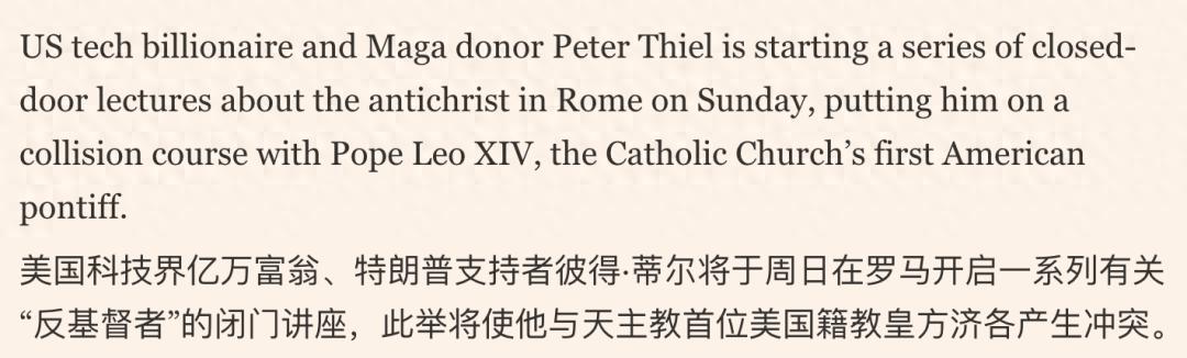 彼得·蒂尔在罗马以近乎决绝的姿态抨击天主教会的主张,他本人在美国政坛倾注巨资、一路保驾护航的核心政治盟友——现任副总统 JD·万斯(JD Vance),恰恰是一位极其虔诚的天主教徒。