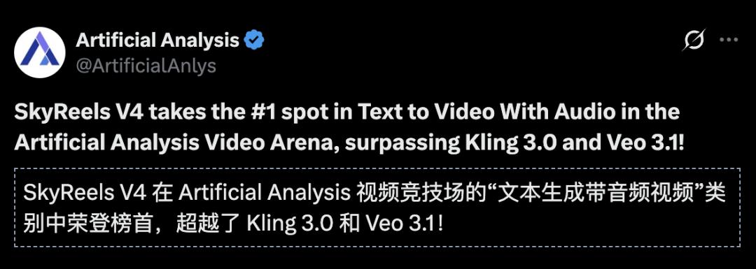 就在刚刚,第三方机构 Artificial Analysis 最新榜单里,SkyReels V4 拿下了「文本生成视频(含音频)」全球第一!