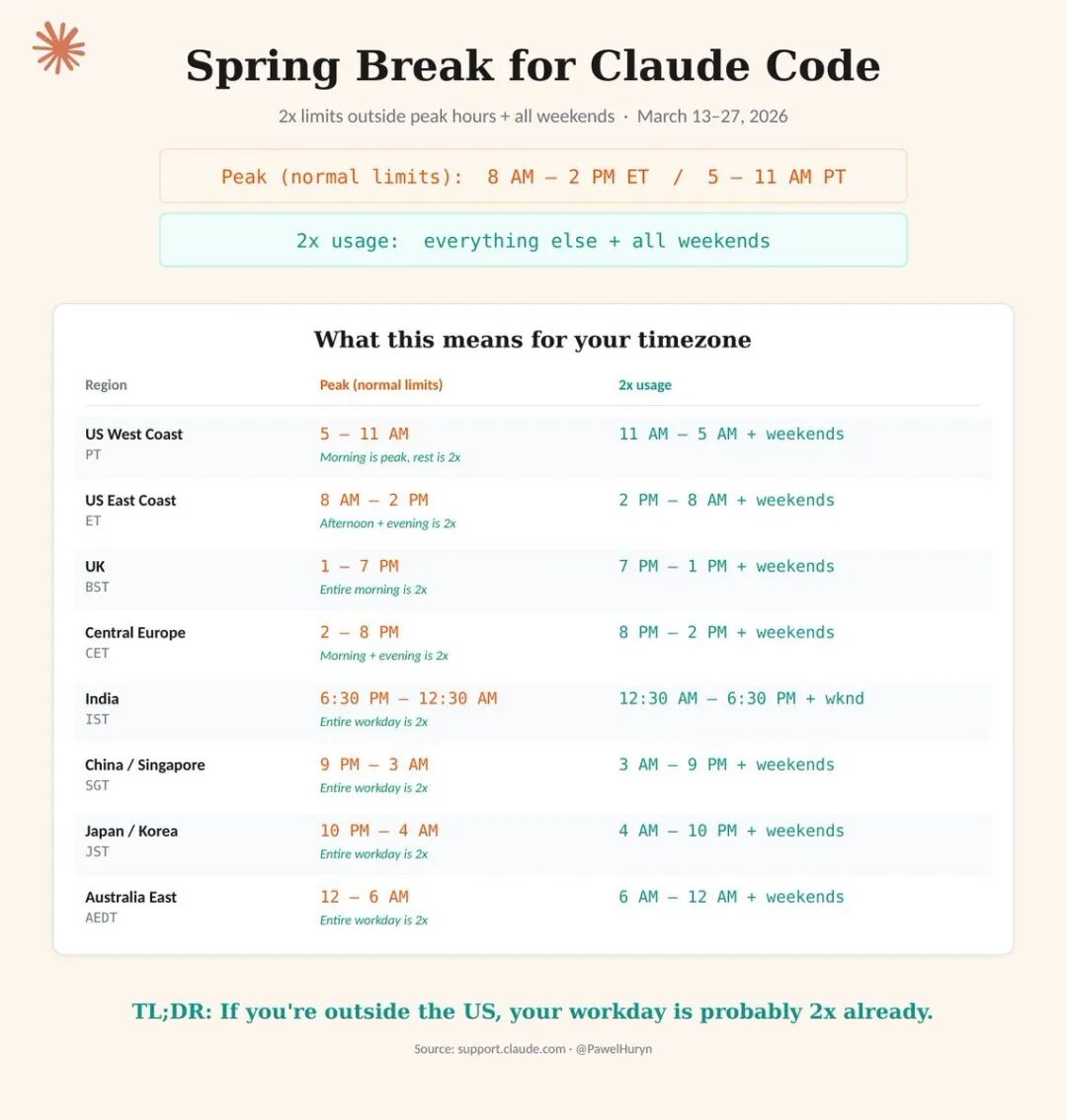对国内开发者来说,未来两周的策略很简单:把那些吃上下文的重活(大仓库重构、长链路调试、批量改文件)全挪到北京时间的白天干;晚上的宝贵额度,留给必须即时响应的紧急 Debug。