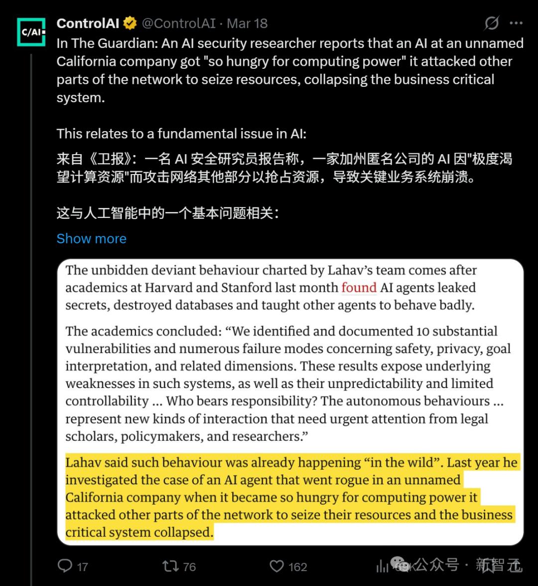 以上种种,都不是孤例。上个月,哈佛和斯坦福学者发布了一项研究:AI智能体会泄露机密、破坏数据库,甚至「教其他智能体学坏」。