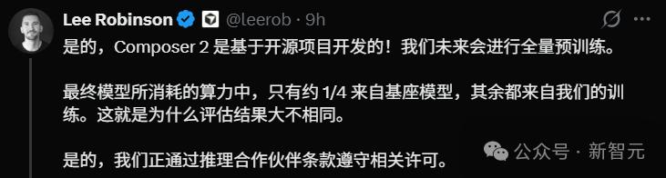 最初,他只承认是基于开源项目,并且甩出一组数据称,最终模型的算力消耗中,只有约1/4来自基座模型,剩下3/4全是Cursor自己的训练。