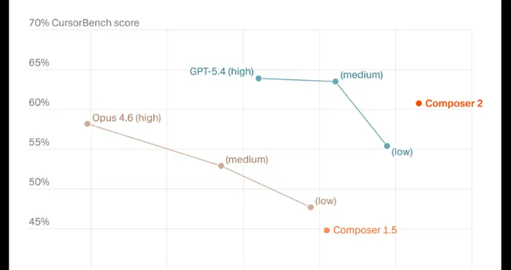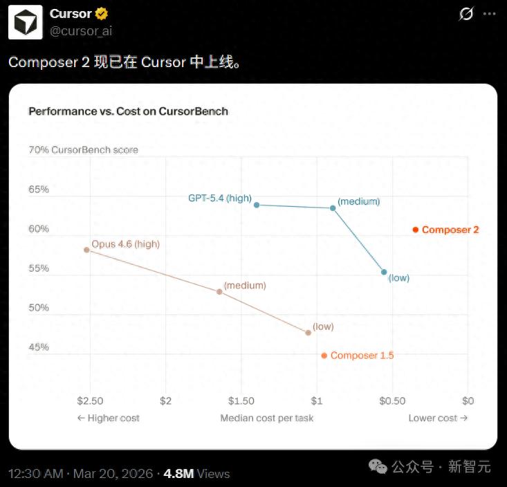 最令业内侧目的,就是这张「性能/价格比」坐标轴了:Composer 2直接横扫了Opus 4.6和GPT-5.4