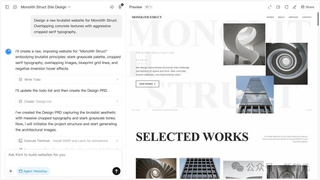 编码能力是K2.5最突出的长板,尤其是前端开发场景。比如,给它一张UI设计稿,K2.5能直接输出带交互动效和滚动触发效果的完整前端代码。
