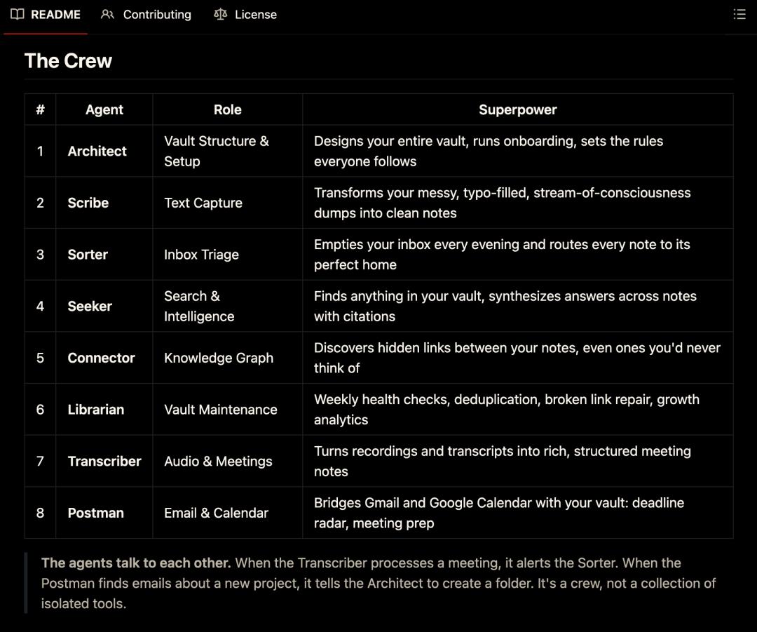 系统由 8 个 Agent 组成,跑在 Anthropic 的 Claude Code 之上,本地 Obsidian 笔记库里运转。