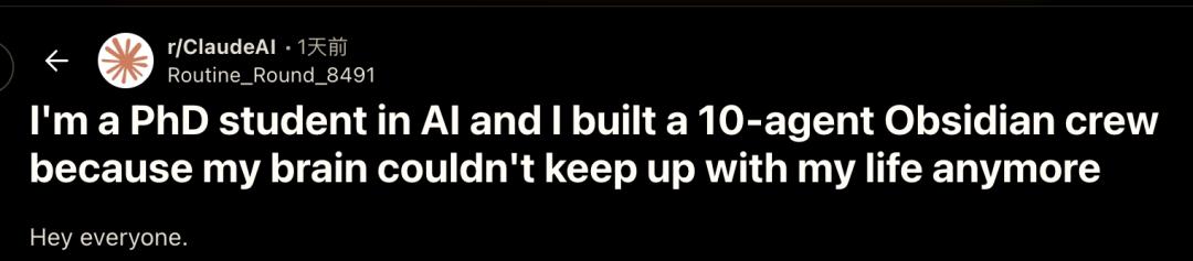 这位 AI 方向的博士生最近在 Reddit 发帖,标题直接点题:《我是 AI 博士生,我因为大脑跟不上自己的生活,搭了一套 10 个 Agent 的系统》。