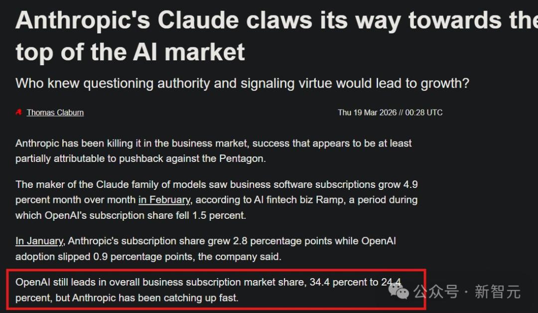 Claude订阅量上月激增 4.9%,而OpenAI则下降了1.5%。